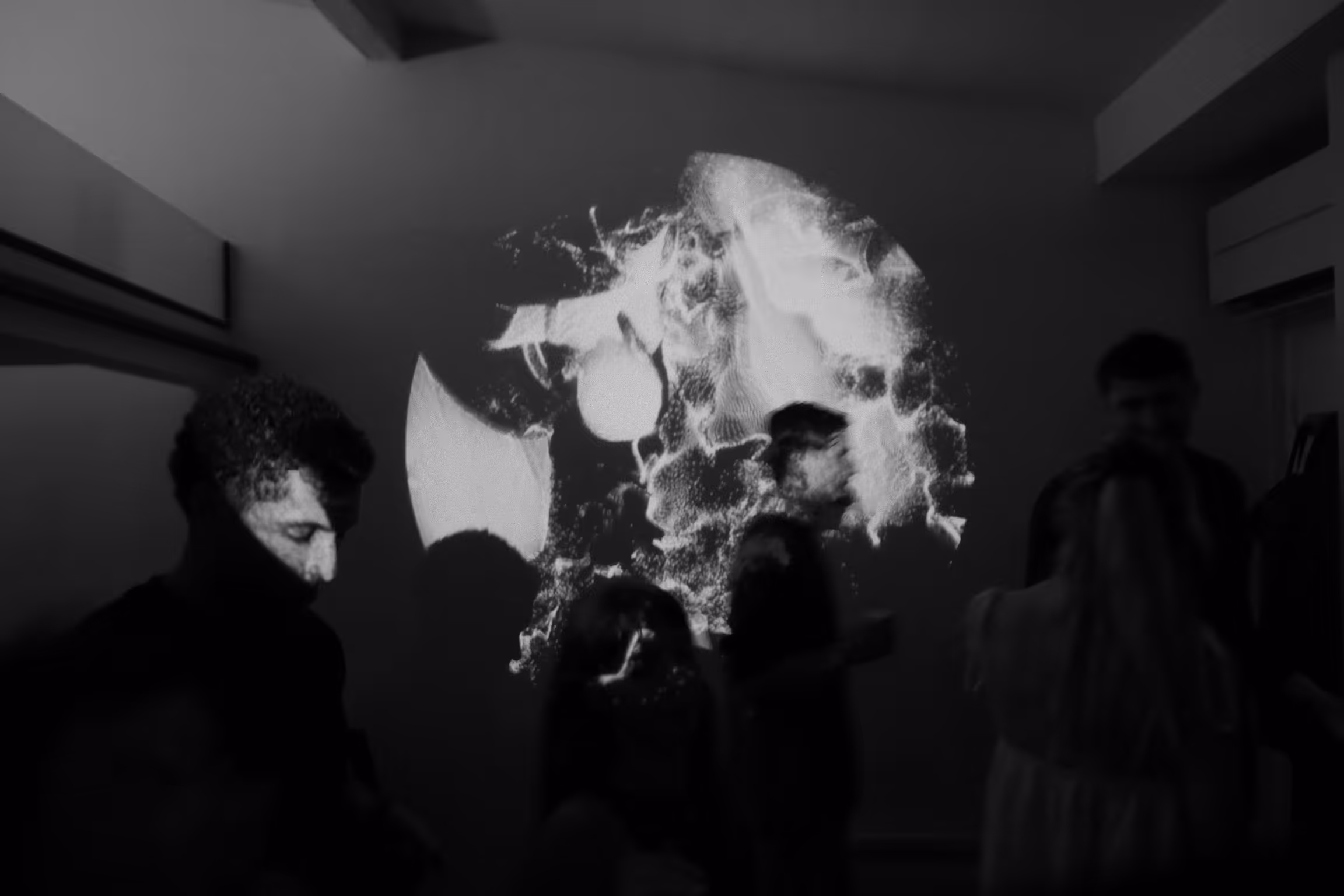 Shadow Extractor was part of a large-scale immersive event combining interactive visuals, live music, and spatial sound. The projection-based installation operated in which participants walk across a white floor beneath a concealed overhead camera. The camera captures the space from above and processes the visual input into a high-contrast threshold map of the floor and the participants’ silhouettes. This threshold map is then used to drive the projected visuals in real time.