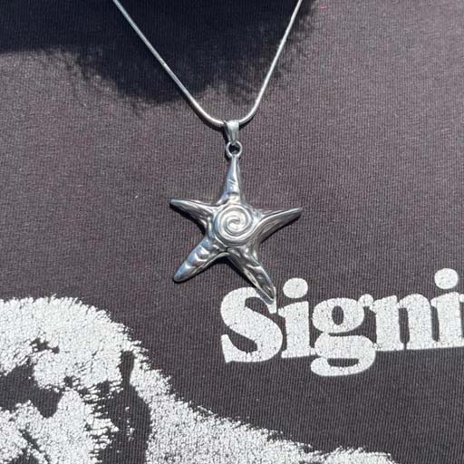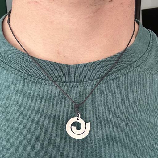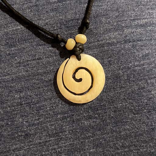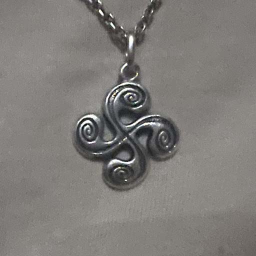 robert's necklace depicting the Lauburu, a symbol from the basque country